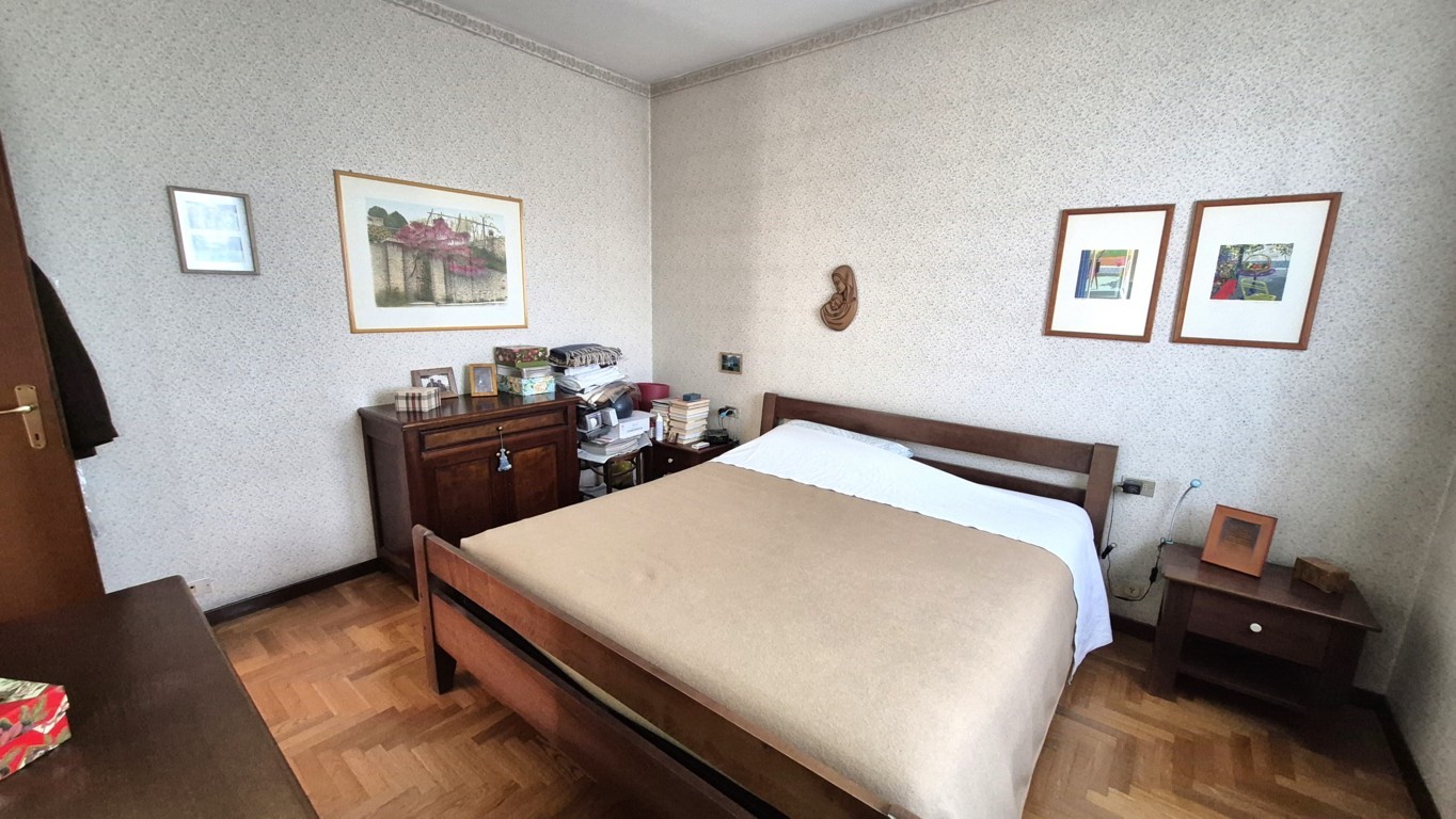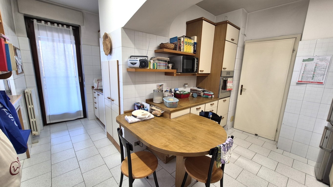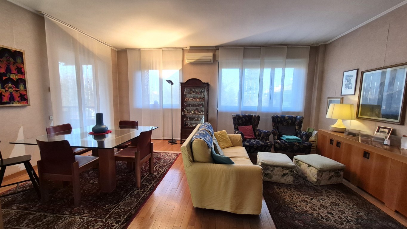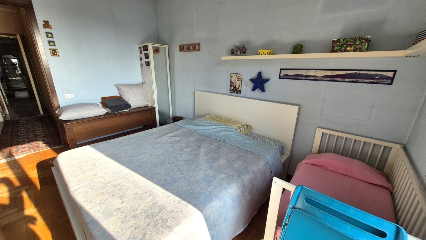 L’appartamento, con una superficie complessiva di circa 160 mq, è composto al piano quarto dall’ingresso, un ampio soggiorno con finestre esposte a Sud-Ovest, la cucina abitabile con vano dispensa, un corridoio notte arredato con armadiatura a muro, due camere da letto, doppi servizi finestrati, terrazzino di circa 12 mq con accesso dalla zona giorno ed un balcone a servizio della camera da letto secondaria.